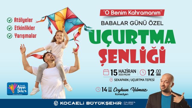 Kocaeli Büyükşehir Belediyesi, Babalar Günü’nü çocuklar ve babalar için eğlence dolu bir şenliğe dönüştürüyor. 15 Haziran Pazar günü Sekapark Uçurtma Tepesi’nde gerçekleşecek “O Benim Kahramanım” temalı Uçurtma Şenliği, ailece vakit geçirmek isteyenleri bir araya getirecek. Saat 12.00’de başlayacak eşsiz şenliğe tüm vatandaşlar davetli.