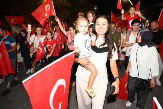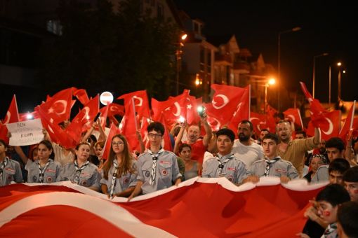 Ataevler Mahallesi’nden başlayan bayrak yürüyüşü, yüzlerce vatandaşın ellerinde Türk bayraklarıyla katılım sağladığı görkemli bir kortejle Osmangazi İlkokulu bahçesinde son buldu.